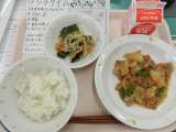 今日の給食は、ごはん、牛乳、五目うま煮、かりじゃこサラダです。 今日の給食の食...