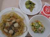 今日の給食 五目あんかけ焼きそば 牛乳 ツナと大根のサラダ 青のりポテト 産地...
