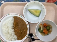 ひよこ豆のポークカレーライス牛乳手づくり福神づけメロン読書週間と関連して、図書室...