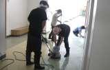 学校主事が2階、3階の廊下の汚れをポリッシャーで落とし、ワックスがけをしています...