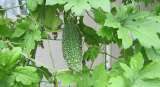 ゴーヤが屋上に向けて蔓を伸ばしています。黄色の花をたくさん咲かせ、小さな実もつけ...