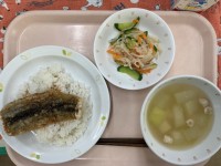 さんまのかば焼き丼牛乳はりはり酢の物とうがんスープ