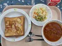 アップルシナモントースト牛乳トマトシチューコーンいりフレンチサラダ今日のアップル...