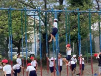 2年生の体育です。固定遊具を使って運動したり、長縄跳びの練習をしたりしました。