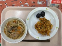 五目うどん牛乳野菜とちくわのかきあげぶどう