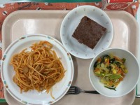スパゲッティナポリタン牛乳小松菜とベーコンのソテーチョコレートケーキ明日はバレンタインデーです。ココアを使ったチョコレートケーキを作りました。