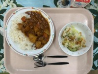 チキンカレーライス牛乳パリパリサラダ今日は1年生最初給食です。配膳がしやすいように食器が少ない献立にしました。チキンカレーライスは「辛いけどおいしい〜!」「食べられたよ〜」と言ってたくさん食べてくれて...