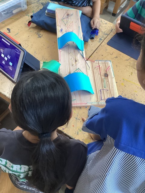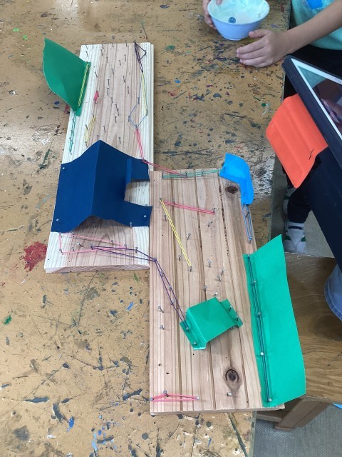 3年生の図工は、「トントンくぎうち コンコンビー玉」。釘を打つ練習です。しかしただ釘を打つ練習をしていたのではつまらないので、たくさん釘を打つ必要があるビー玉転がしを作って見ました。グループで協力してコースを考えながら釘を打ったり、ゴムや色画用紙でプラスαの工夫をして見たりと、楽しみながら作り、作った後も楽しめる楽しい学習になりました。