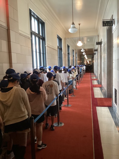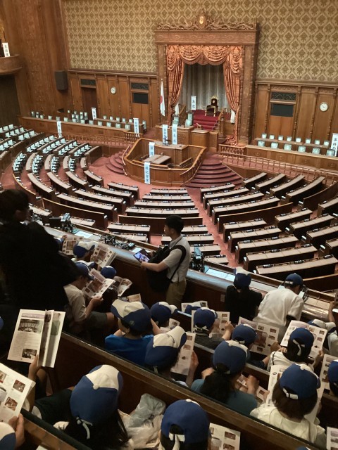 まずは国会。1学期に社会科で学習し、教科書や資料集等で見た国会に実際に足を踏み入れることで、学習したことを想起したり新たな疑問が生まれたりしていました。傍聴席から見た本会議場に圧倒されながらも、細かいところまで観察する姿が見られました。