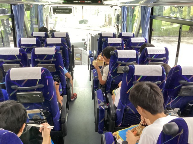 子どもたちが待ちに待ったお弁当タイムでしたが、外は生憎の雨。皇居外苑公園で昼食の予定だったので、バスの中で食べました。それでも、近くの席の友達と楽しそうに話をしながら食べることができました。