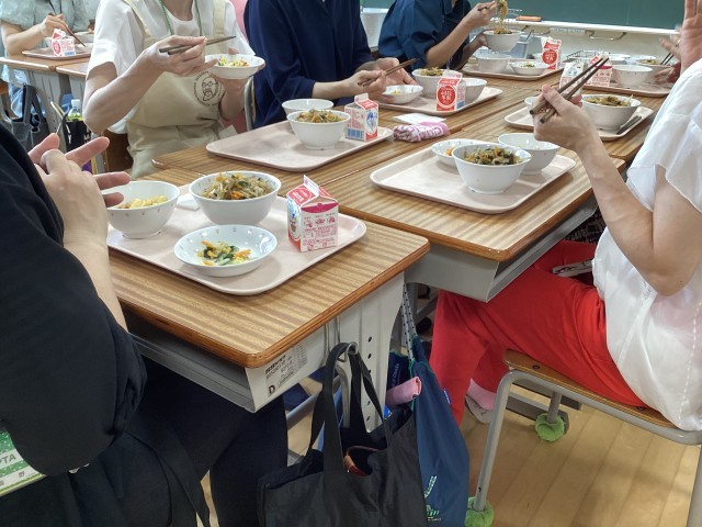 参加された保護者の方々は、久しぶりのそして普段我が子が食べている給食に興味津々。以前は麺類といえば、「ソフト麺」といわれたうどんか、はじめから煮込んだ状態でちょっとのびたうどんあたりが定番でした。その後ラーメンが初めて出てきた頃は、「?」なお味で子どもにとっての人気メニューではありませんでしたが、最近は、給食のラーメンは美味しいものになり、人気メニューの一つです。保護者の皆さんも味を確かめながら食べていました。久しぶりの給食試食会、給食を知っていただく良い機会になったように思います。