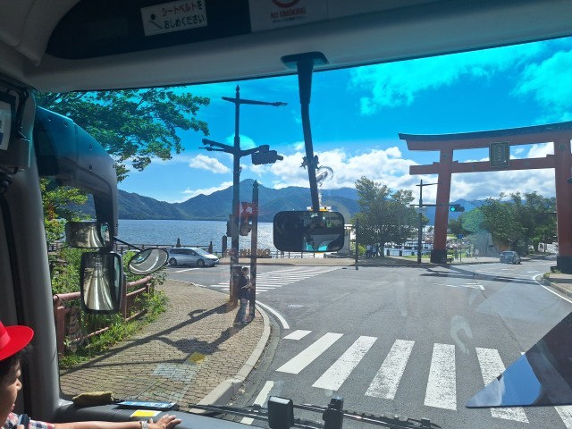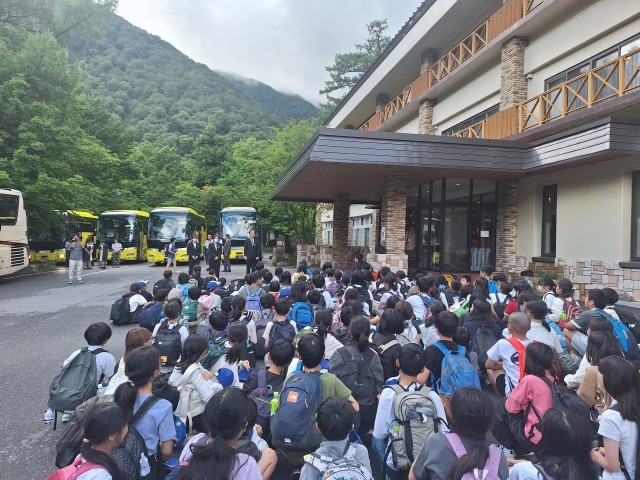 足尾を出発し、いろは坂を上り、カラオケで熱唱し、途中車窓から中禅寺湖と男体山に感動し、猿や鹿に歓声をあげながら宿に到着しました。開校式をし、各部屋に入りました。このあとは、日光彫体験です。