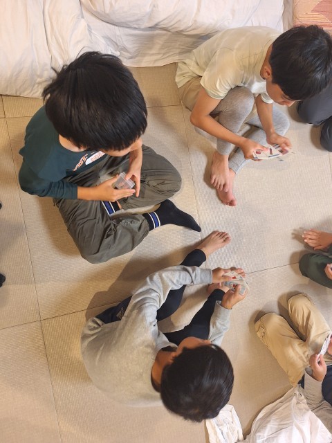 このあとは、キャンプファイヤーがあるので、夕食前に入浴。順番待ちの間は、荷物整理とリラックスタイム。トランプやUnoをしたり、のんびり休んだりして過ごしていました。夕食後、キャンプファイヤーになります。