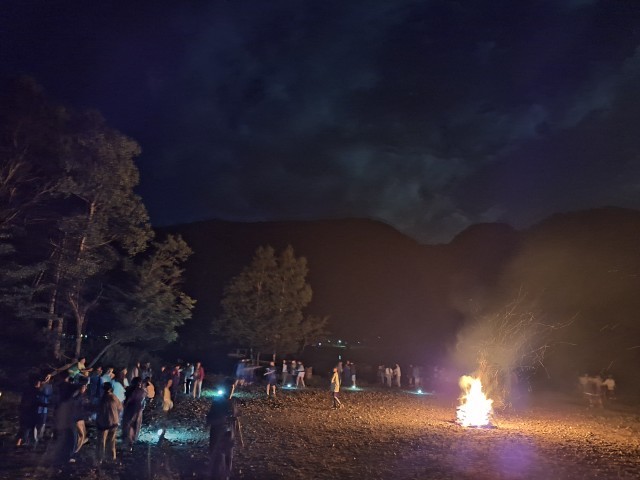 火の神と火の子が点火し、炎があがると大盛あがり。