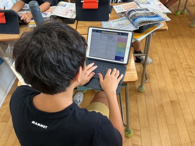 単元の中のいくつかの共通の課題を順番に調べ、あとで情報交換や確認をしていくことで、個々で学習し進度が多少異なっても、学習内容は共通のものになっていきます。個々での自主的な学習を大切にしながらも学習内容はきちんと押さえていく。今、5年生の社会科ではこのような学習方法で学習をすすめています。子どもたちも一方的に先生の話を聞いて黒板をノートに写していく学習と違って、自分で学習をすすめられるため、学習への満足度も高いように感じます。