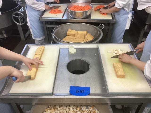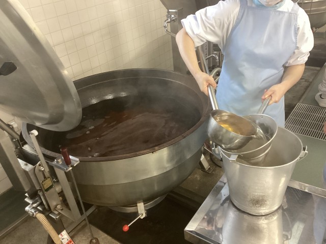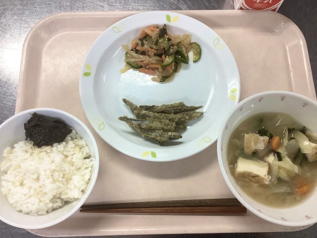 今日は、「発芽玄米」という種類のお米を混ぜて炊いています。発芽玄米は、米を精米する時に少し皮を残した玄米が発芽したものです。白米よりビタミン類や食物せんいが多いです。のりの佃煮と一緒に美味しくいただきましょう。