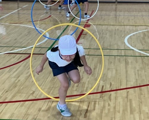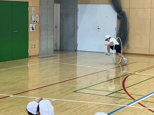 3年生は、フラフープのいろいろな技に挑戦していました。