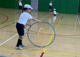 フープを「回す」と「転がす」に分かれてそれぞれ技に挑戦します。