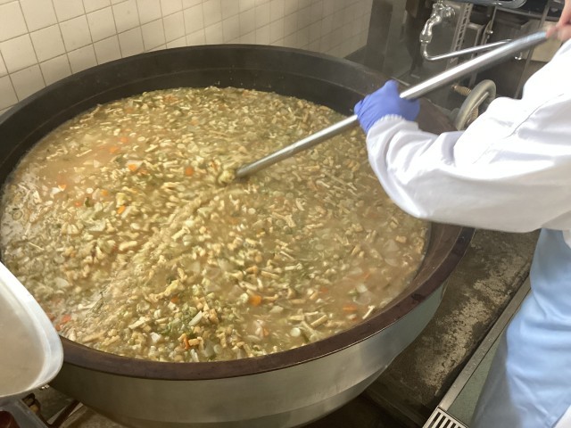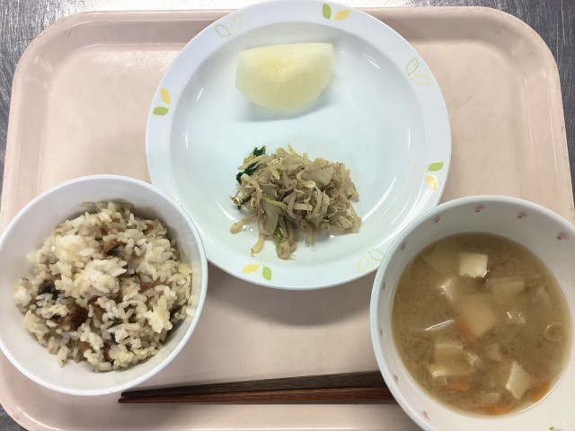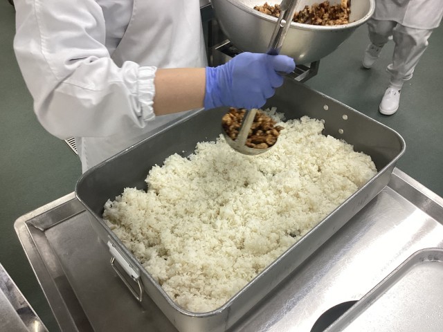 さんまは、秋になると日本より北の海から北海道の海にやってきます。えさをたくさん食べてやってくるので日本では脂がのった美味しいさんまを食べることができます。今日はさんまをから揚げにした後、たれをからめてごはんに混ぜ込みました。秋の味覚のさんまを味わいながら、よくかんで食べてください。