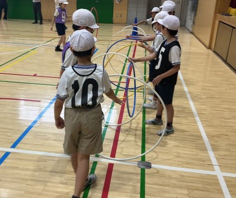 この学習が始まった頃は、手や腰のあたりでフープを回したり、コロコロとフープを転がしたりしていましたが、取り組むたびに新しいやり方を発見したり、それを組み合わせたりと進化してきました。子どもたちの「できた」「もっとやってみたい」「もっと違うやり方はないかな」という思いが、そして、お互い交流することで動きがどんどん進化してきました。