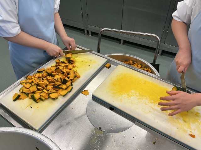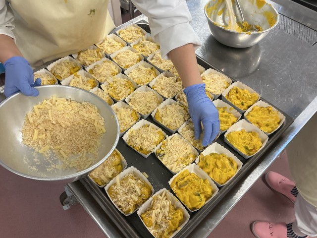 今日は、蒸したかぼちゃとベシャメルソースを合わせ、チーズとパン粉をのせて焼きました。「ベシャメルソース」は、バターと小麦粉、牛乳で作ったフランス料理の基本のソースです。なめらかなソースがたっぷりのグラタンをぜひ味わって食べてください。