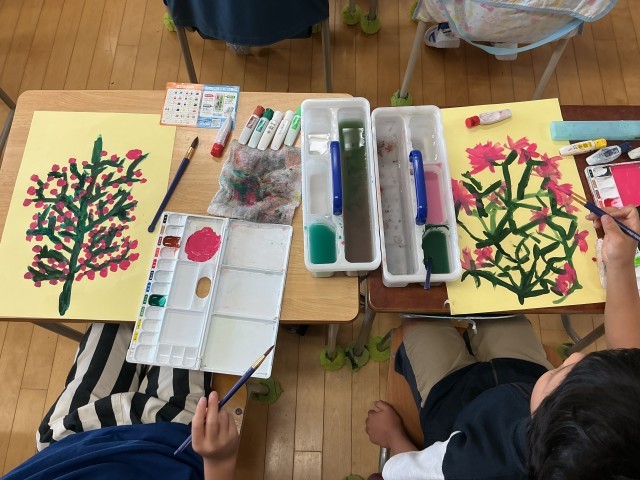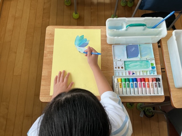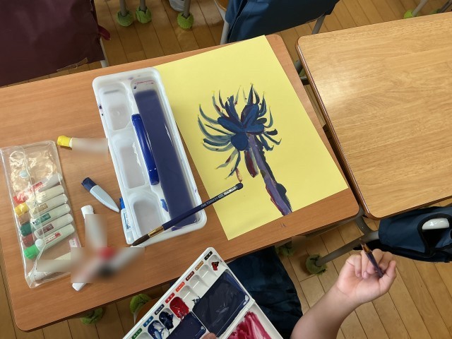 3年生の図工の時間。絵の具を使って花を描いていました。