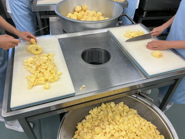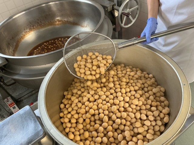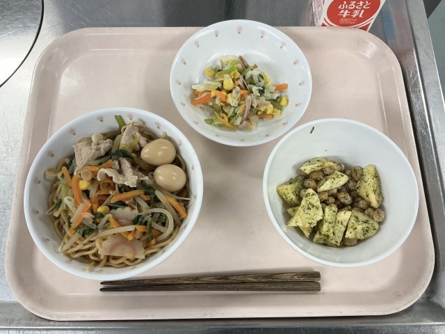 今日は、多聞小学校で人気のある丘の子ラーメンです。豚骨やとりガラなどを煮込んでとったスープに、野菜や豚肉、なるとなどが入った具だくさんのラーメンです。うずらたまごを調味料で煮て作った煮たまごといっしょに食べましょう。