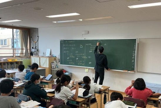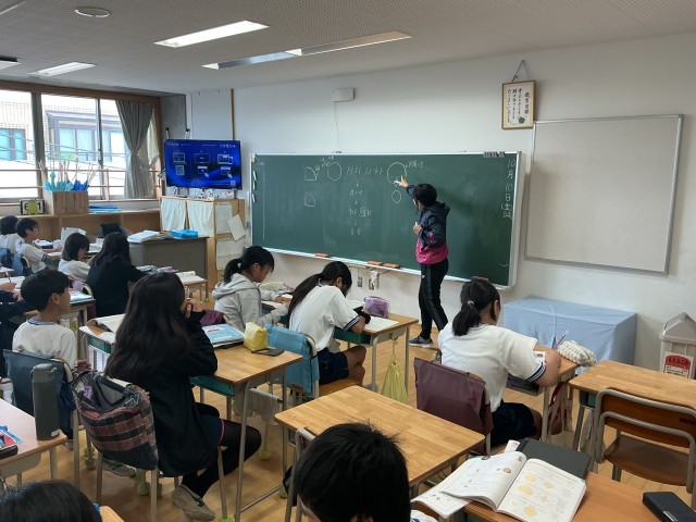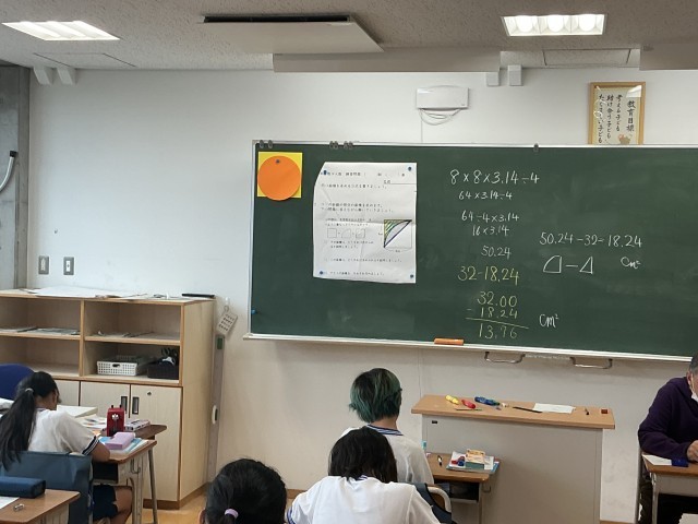 円の面積の学習も終盤。円を細かく分けて並べ替え、ほぼ長方形になるというところから公式を導き出しました。そして、円の面積を求める問題も解いてきました。最後は難題の円の面積を求める公式を使いながらも、複雑な図形の面積を求める問題。
