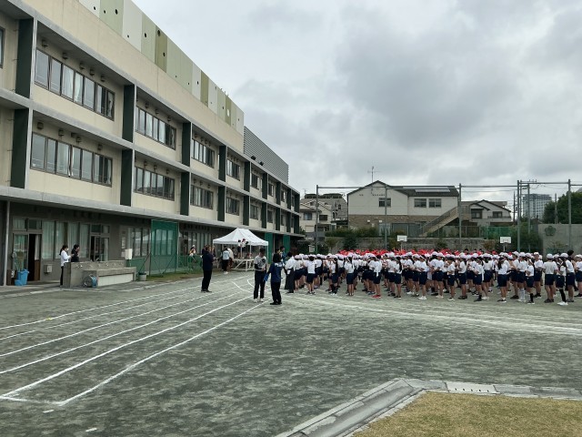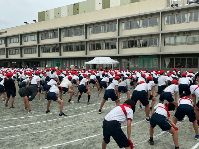 今日の1校時は、運動会全体練習の2回目。今日の練習は、得点発表、閉会式、整理運動、応援歌などです。