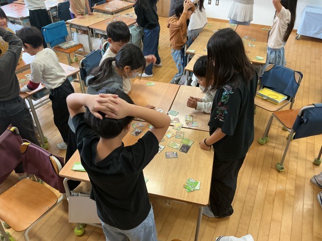 3年生は、日本語の時間に「世田谷かるた」に取り組んでいました。例えば「世田谷の 美術館の前には 女神像」「うかれだす たぬきばやしの 笛太鼓」など世田谷の特徴や様子などを盛り込んだものです。子どもたちは、楽しみながら自分の郷土について学ぶことができます。読み札が読まれると、子どもたちは真剣に札を取っていました。