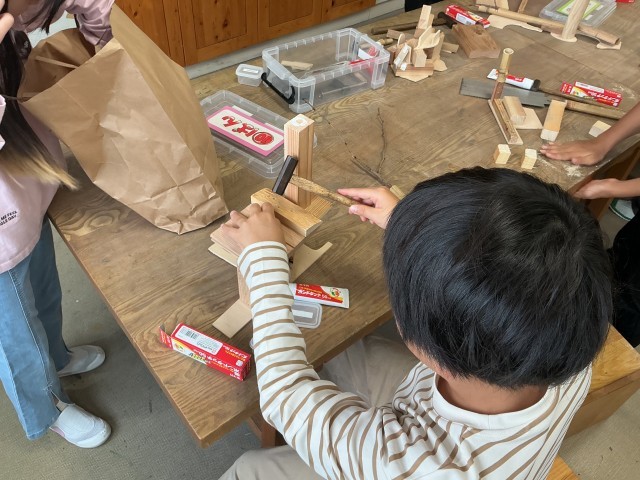 発信塔なので高さにこだわって高く作る子、枝や穂先を使って発信するイメージで作っている子、竹筒を使って煙突のような形にしている子などそれぞれのイメージでバラエティーに富んだ造形になっています。どこに向けてどんな情報を発信するのか、はたまた遠い宇宙からの電波をキャッチするのか、楽しい塔づくりが進んでいます。