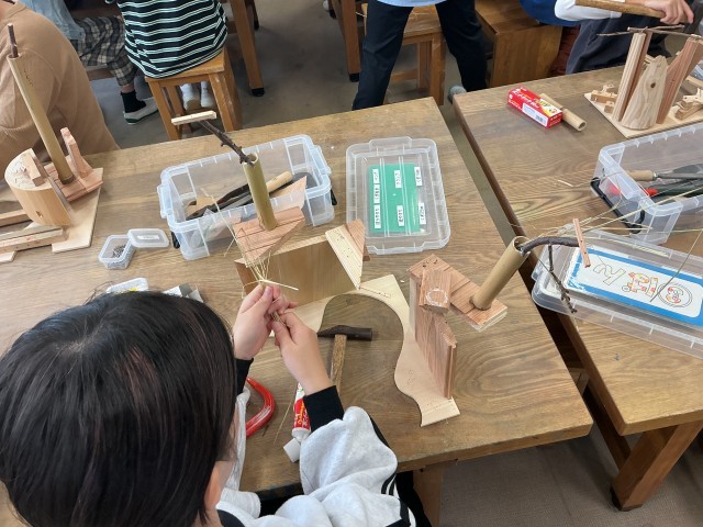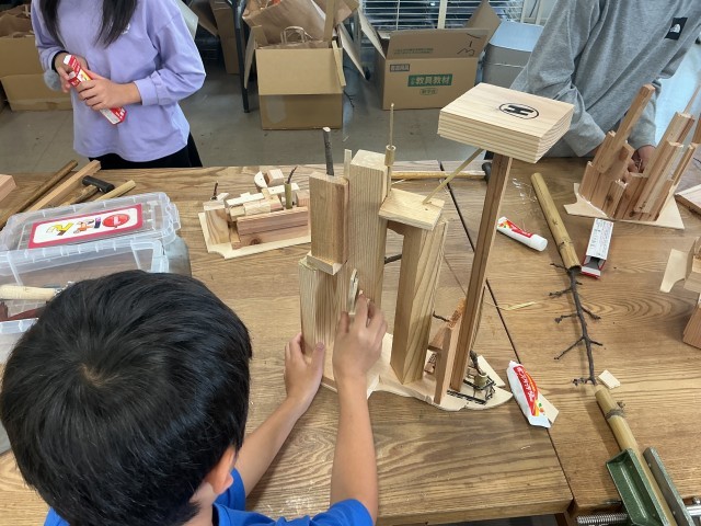 4年生の図工は、「木まぐれ発信塔」誰に何を発信するのか想像しながら、形のバランスを考えて木片などを使って発信塔を作っています。