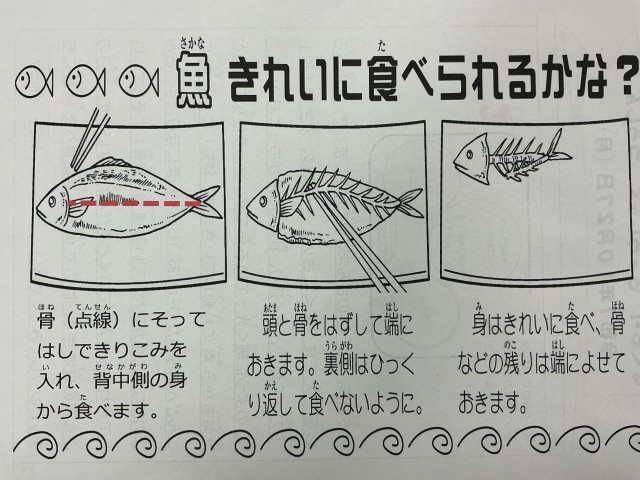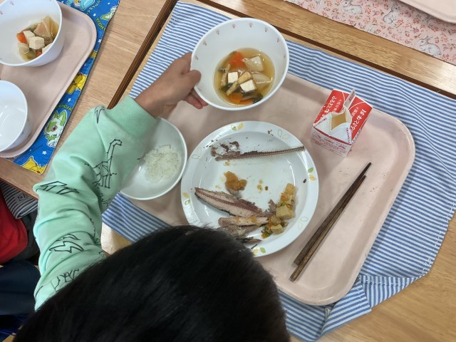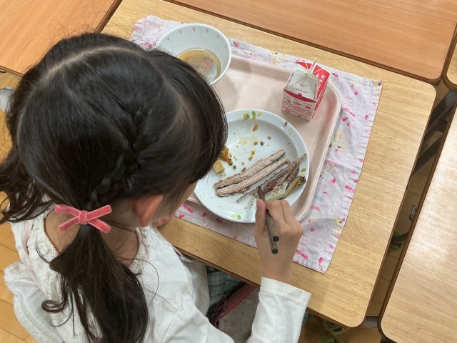 その秋刀魚ですが、子どもたちにとっては食べるとなるとちょっと難題。栄養士が今日の給食に因んだ話を載せて、日々各クラスに配布している給食通信の裏面に「魚 きれいに食べられるかな」として、魚の骨のとり方をレクチャー。綺麗にとって食べている子もいましたが、中には丸かじりしようとしている子も。最近は、家庭で魚を食べる機会が減っているといいますし、魚が出てきてもすでに骨をとった状態ということも多いかと思います。今日お子さんが帰ってきたら、秋刀魚を上手に食べられたか聞いてみてください。もし、うまくいっていないようでしたら、ご家庭でも秋刀魚に限らず骨(背骨〕をとって食べる練習をしてみてください。