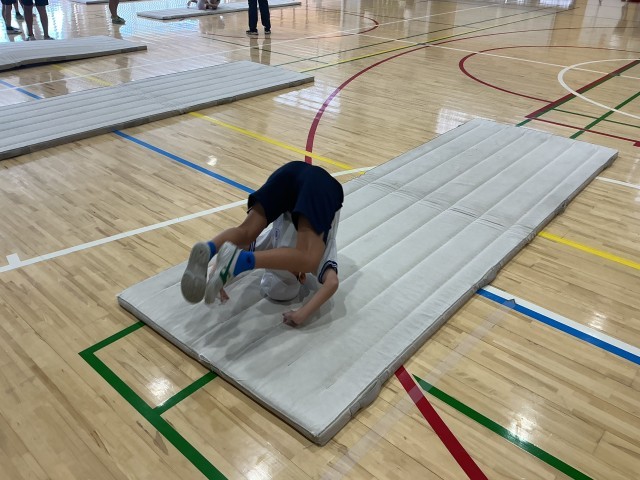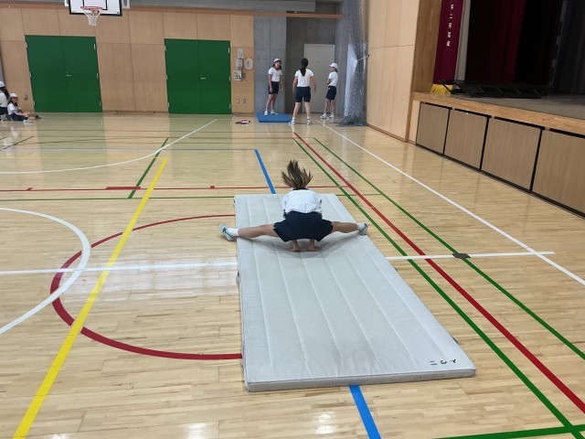 5年生の体育は、マット運動。前転、後転、側転、倒立系の運動をしていきます。
