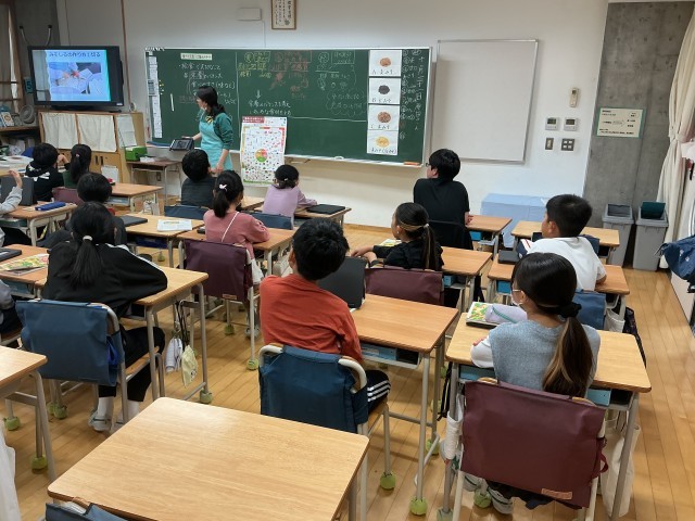 5年生の教室では、家庭科の授業。先日、調理実習で味噌汁を作りました。今日は、味噌汁の栄養素についてや味噌の種類についてなどの学習をしました。そして、学校給食で味噌汁を作るとき、実際はどのように作っているのか、調理実習に続いて本校の栄養士にも授業に参加してもらい学習しました。献立に味噌汁があった時の調理の様子を動画に撮ったものを見ました。調理員さんの手際のよさや、大量の材料にびっくり。子供たちが自分たちで作った時のことを思い出しながら大根を切るスピード、大根や厚揚げの量に驚いていました。自分たちが食べている給食の実際の様子を知ることができ、有意義な時間になったようです。