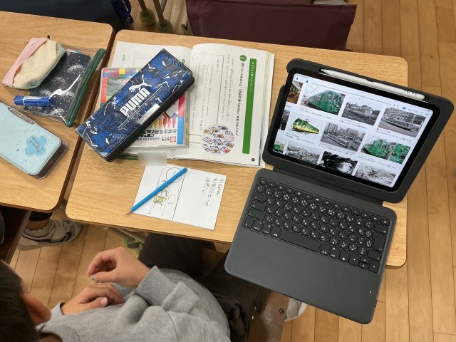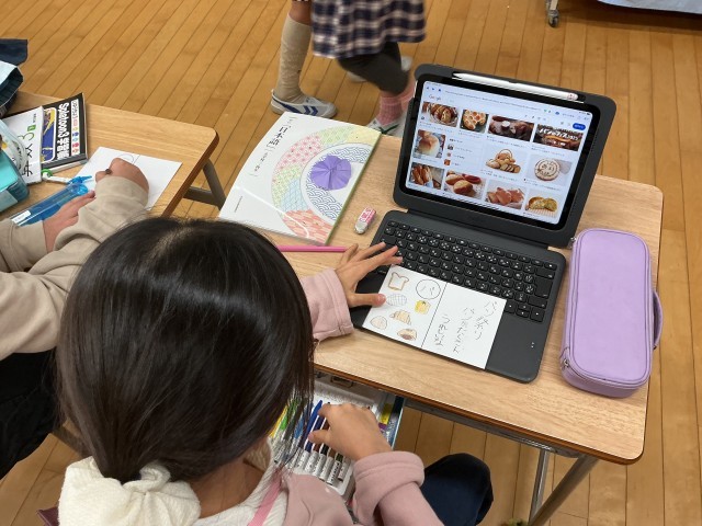 あるクラスでは、社会科で先週のスーパーマーケット見学のまとめとして新聞づくり。見学の時には、スーパーマーケットのご好意で、バックヤードを含めあちこち見せていただき、詳しく説明をしてくださいました。この見学で分かったお店の工夫について、新聞の形にまとめています。また別のクラスでは、日本語の世田谷かるたのまとめとして、自分たちなりの世田谷かるたづくりをしていました。ある子は玉電のことを、別の子はパン祭りのことを題材にしていました。