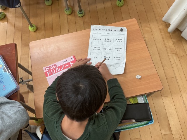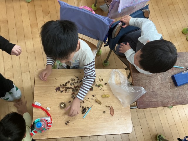 1年生は、どんぐりをたくさん集めてきました。また、見つけたものを「あきをはっけん」カードに記録していました。「ツルツルしたもの」「まあるいもの」など、見つけたものに丸をつけていました。最近、夏のあとちょっと秋がきたかと思うと急に寒くなって一気に冬、というような気がします。秋が短くなっているように感じます。せっかく四季のある国にいるのですから、秋もしっかりと感じたいですね。