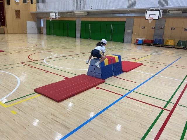 2年生は、跳び箱の前段階。開脚跳びに向けて、手のつき方、踏み切った後の前へ進む感じを掴む練習をしていました。