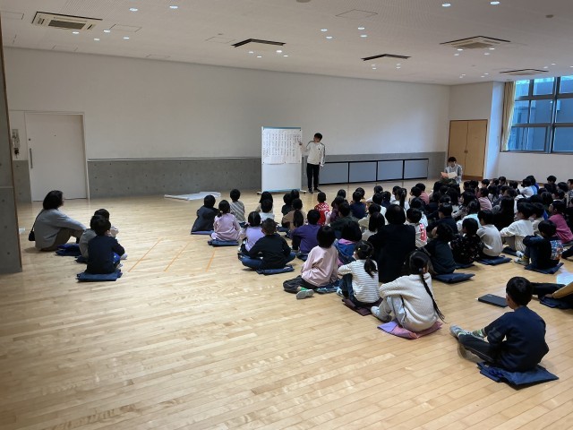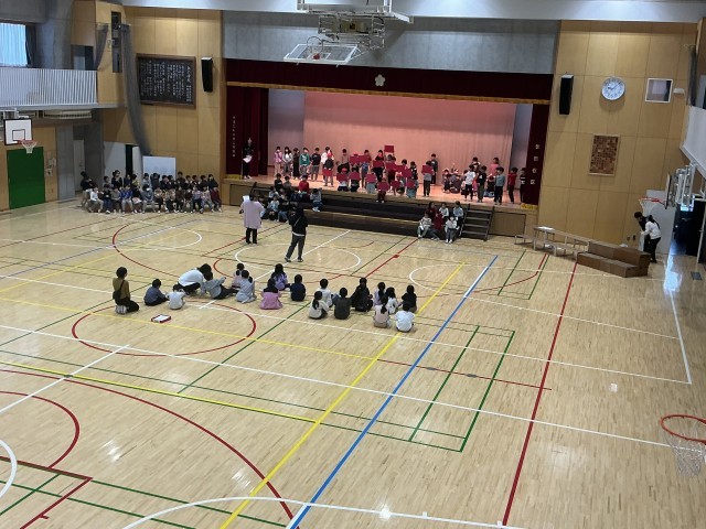 2年生は、国語で学習した「スイミー」をどのように学習したのかがわかるように、生活科や音楽、図工、体育などの要素も入れて表現していきます。今日は、体育館が使える練習日。教室とは違うスケール感に合わせての練習です。