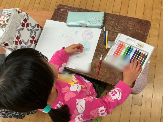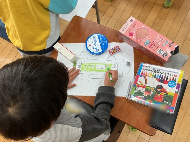 1年生の教室では、算数でかたちの学習。家から持ってきた箱や缶、ペットボトルなど、さまざまな形のものから形を写しとり、お花や電車など思い思いに絵を描いていました。