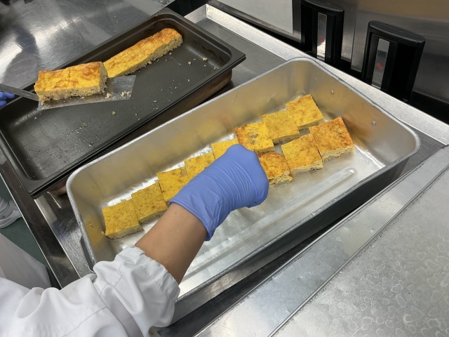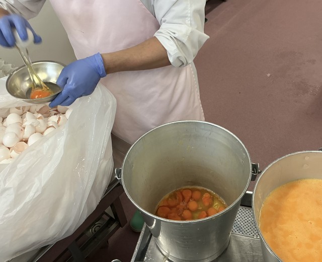 ひき肉入りオムレツは、ひき肉と玉ねぎを炒めて味付けし、蒸したじゃがいもと溶き卵と合わせて天板に流し入れ、オーブンで焼いて作ります。今日のオムレツでは800個近くの卵を使いましたが、卵は調理員さんが1つ1つ手で割っていて、1つ割った後に殻などの混入が無いかを毎回チェックしています。