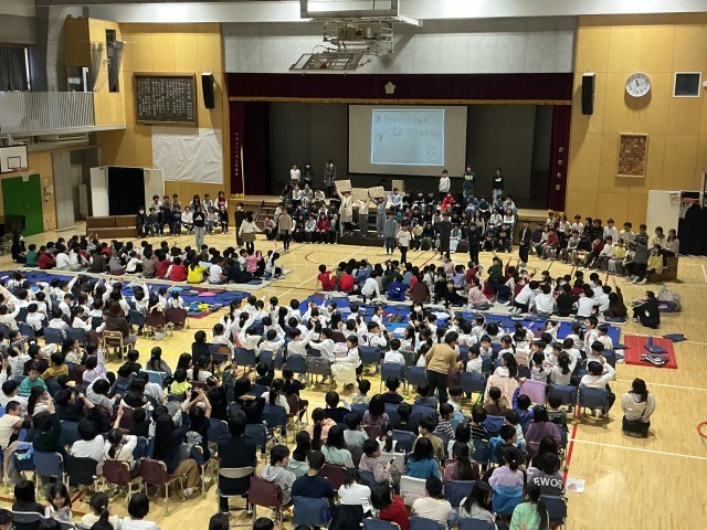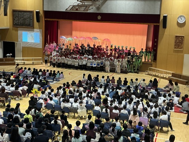 いよいよ本番1日目です その3 公開日 2025/12/05 更新日 2025/12/05 校長室より 2年生は、みんなよく声が出ていました。自分たちで作った衣装、運動会で使った傘をリメイクしたクラゲなどカラフルな舞台になりました。4年生は、途中にクイズを設定したり、ファッションショーをしたり。多学年の子どもたちもクイズに嬉しそうに参加し、4年生の狙い通り。4年ジャーのキャラクターも親しみがもてました。 いいね(2)