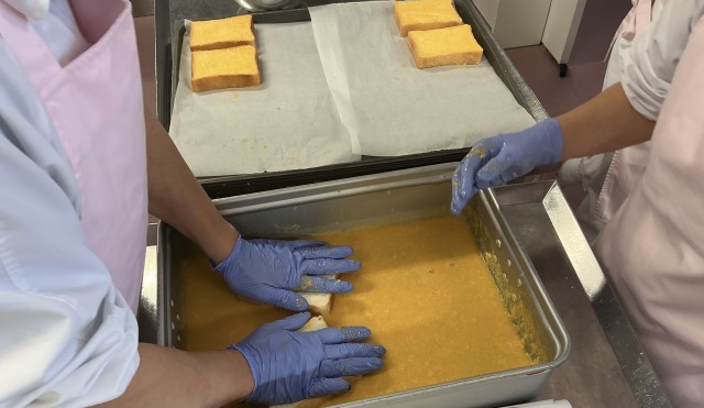 オレンジフレンチトーストは、卵、バター、さとう、オレンジジュースを合わせた卵液にパンをひたし、オーブンで焼いて作ります。オレンジの風味が美味しい、ふんわりしっとりとしたトーストが出来上がりました。今日は学習発表会の児童鑑賞日でした。給食をしっかり食べて、明日の保護者鑑賞日も頑張ってください。