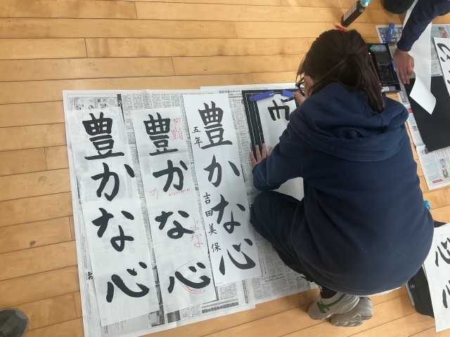 年明けといえばおせちにお年玉もありますが、「書き初め」です。早速5年生の教室では、書き初めの練習が始まっていました。今年の5年生は「豊かな心」に取り組みます。どの文字も難しそうですが、特に「心」は文字のバランスをとることが難しそうです。お手本をよく見て、文字のバランスに気を付けながらしっかりと書いていきましょう。