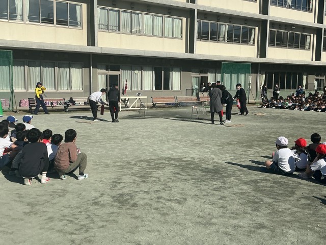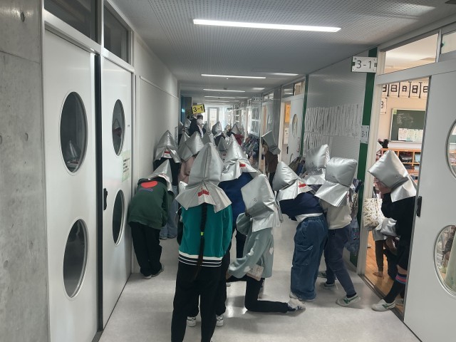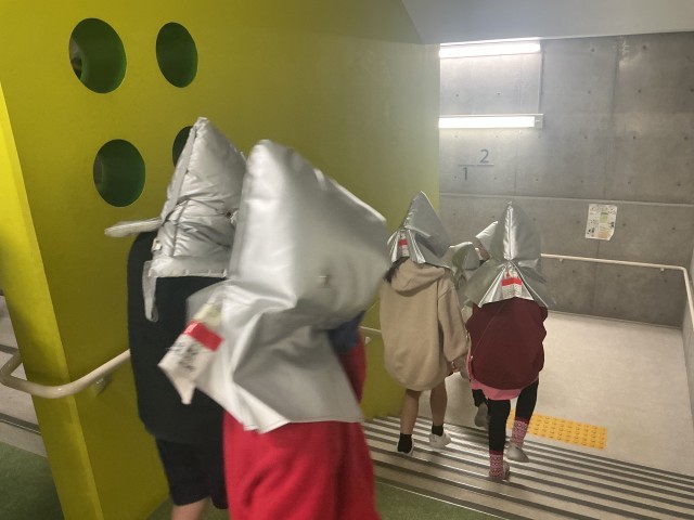 子どもたちは放送を静かに聞き、防災頭巾を被り口をハンカチなどで覆って静かに避難ができました。教室からの移動中、校庭に集まってから、そして話を聞く場面と、自分の身は自分で守るという意識をもって取り組むことができた子どもたちがほとんどでした。