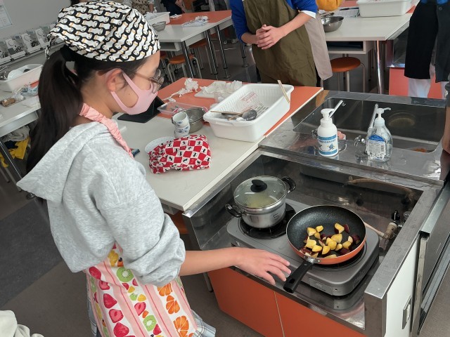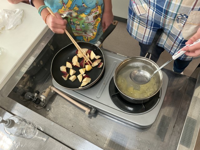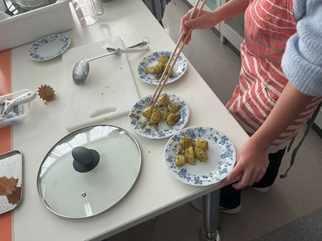 青のりじゃがバター炒めの方は、茹でてしまえれば塩とバターで炒めればよいので比較的簡単です。ちょっと大変だったのが大学芋。砂糖や醤油を使ってタレを作るのですが、砂糖を火を入れて溶かしながら混ぜていくところで若干苦戦しているグループも。