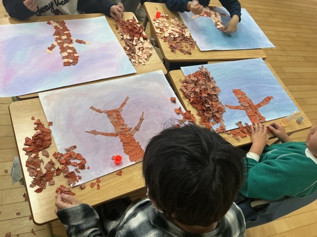 2年生のクラスでは図工の時間「ふしぎなタネやさん」。先週、子どもたちが茶色系の色画用紙を細かくちぎっていて「今度木を作るんだ」と言っていました。画用紙にパステルで色をつけて背景(下地)にしてあります。そしてここに先週ちぎった紙を木の形に糊で貼っていきます。色合いや木の形を工夫しながら、また木の幹を画用紙のどのあたりにするのか、枝は横方向か縦方向など考えながら作品作りをしていました。
