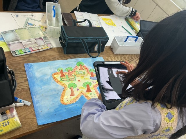 図工室では、4年生がもし自分が星をかったとしたらどんな星?と想像を膨らませて絵を描いていました。星の形も星の特徴も様々。リゾート地のような星もあれば、たっぷり遊べる星、ショッピングが楽しそうな星・・・とバラエティーに富んでいます。絵が描き上がったらタブレット端末で写真を撮り写真も提出。これが鑑賞カードになりクラスのみんなの作品をお互いに見ることができます。友達がどんな発想で自分の星を描いたのか見合うのも楽しみです。