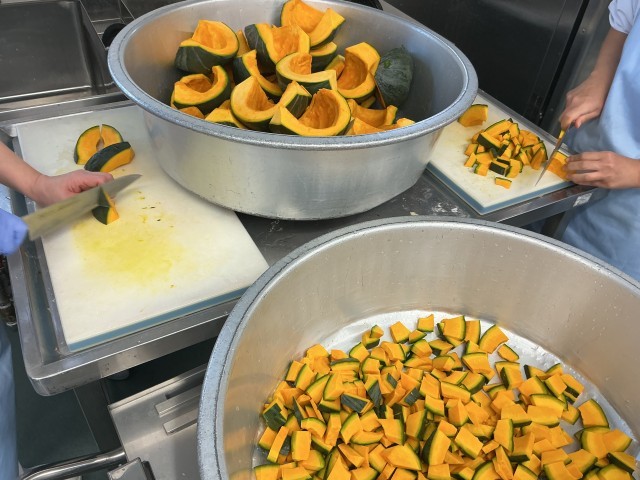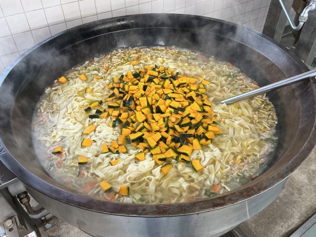 今日、12月22日は「冬至」です。冬至は1年で一番昼の時間が短くなる日です。冬至の日にかぼちゃを食べたりゆず湯に入ると、かぜをひかないといわれています。冬至ということで、今日のほうとうにはかぼちゃをたっぷり使い、大根のゆず漬けにはゆずの果汁と皮のすりおろしを入れました。ほうとうのかぼちゃと大根のゆず漬けのゆずで冬至ならではの食べ物を味わいましょう。