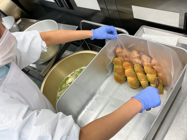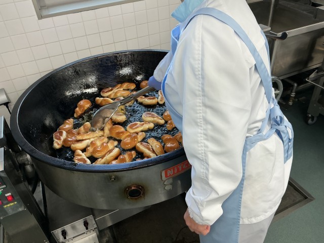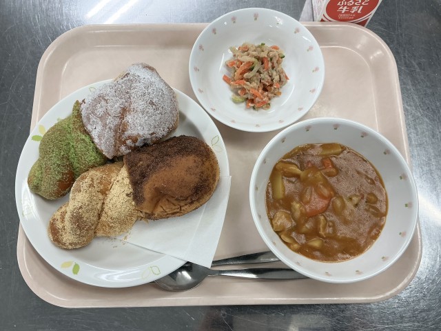 今日は、給食委員会の皆さんが考えたセレクト給食です。今回は、揚げパンの味付け4種類から好きな味を選んでもらいました。1番人気だったのはココアで、300人くらいの児童が選んでいました。4種類の揚げパン作りに調理室は大忙しでしたが、無事においしい揚げパンができ上がりました。子どもたちも自分の選んだ味の揚げパンを美味しそうに食べていました。